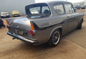 Body - Standard Anglia shell with all the rot removed and repaired. Car was then fully repainted throughout including underneath. The finish is very good and the car has virtually done next to no miles since being built so there are no stonechips or gravelrash. When the previous owner built it he added a fibeglass bootlid and wings for lightness as its a modified car rather than a period correct concourse car. The car looks superb in the grey black / combination and stands out from the rest.