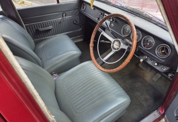 Body - 4 Door Corsair. The car was originally a dark Maroon colour from new, still seen under the bonnet. Its been repainted at some point in its life a brighter metallic red. It has had repairs in the boot floor, front floors, inner sill areas, strut tops have been plated. Most of the repairs were to MOT standard rather than restoration standard. Paintwork is also showing its age. There is bubbling on bottoms of 3 of the doors, . Rear arches are OK. Chromework is pretty good and all intact.