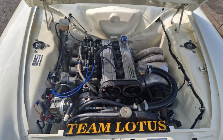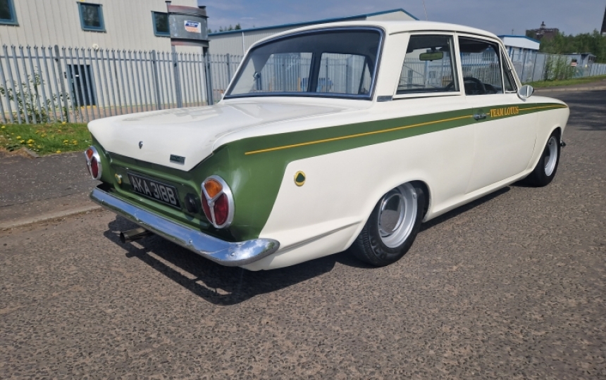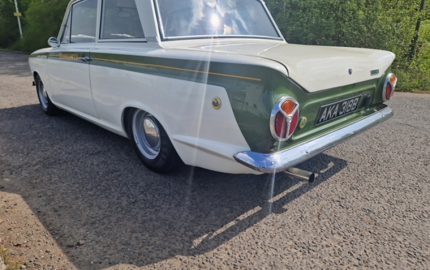 Body - Mk1 Cortina 2 Door shell which started its life as a Deluxe Model. Its had some work underneath in the past, as most have but is currently solid. Its allpainted body colour underneath and not caked in the underseal. Paintwork is nice and tidy and stands out with the additional Team Lotus decal. The car looks to have had arches and repairs to rear lower quarters in the past as there is evidence of a bit filler in these areas. If you want a show winner this might not be for you but if you want something that looks good and has a decent bit poke then read on. Good quarter bumpers, window rubbers and trim