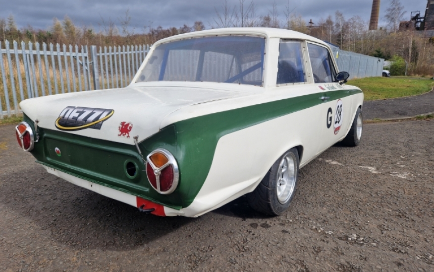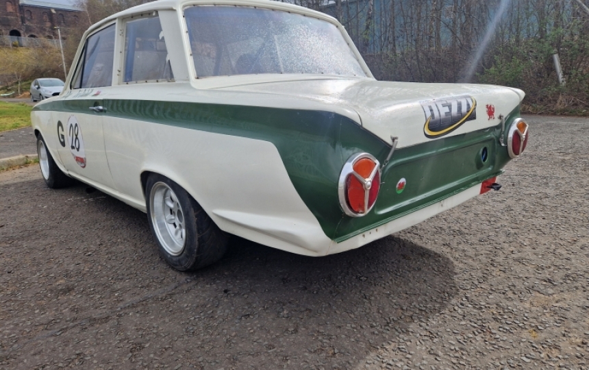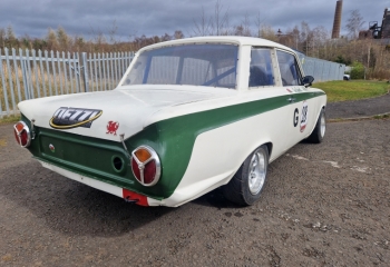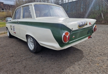Body - 2 Door Cortina MK1. Good solid shell. Has had some repairs over the years and some strengthening plates added.; Has top links on the rear axle and a panhard road fitted on the rear. Has a few bruises here and there. Windows are all poly and not glass. No bumpers fitted. Quarter windows are missing but we will try and find a set. Strut top holes have been widened to give extra camber. Paintwork is ok but no show winner. Inside the boot has been removed and flat plated and a race fuel cell installed.