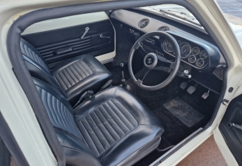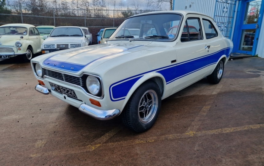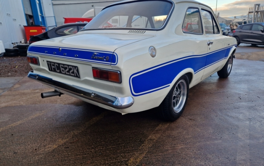 Body - Mk1 Escort standard shell. At the time of rebuild, strut top strengtheners and tramp bar brackets were added. Car is completely solid from front to back and is all body colour underneath. Paintwork is really nice. We are told it was a bare metal respray. Its also got metal RS wings. RS stripes were recently added but can be removed if buyer prefers a plain white car.Panel gaps are pretty good and the doors sit properly in the apertures. All new window rubbers and door rubbers.