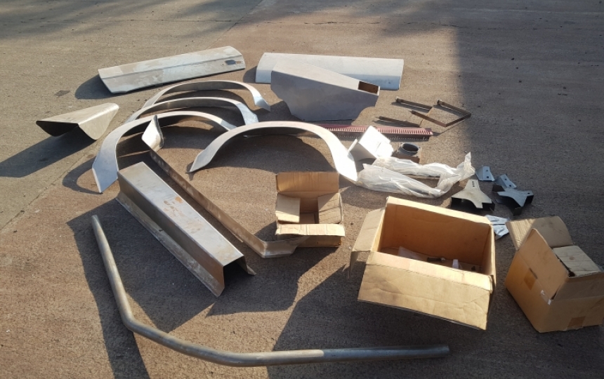 With the shell there is four alloy arches, alloy front spoiler, pair of door skins, gearbox tunnel, diff tunnel, tank platform and straps, bars for weld in cage, panhard rod bracket. Underneath it has a 6 linked 52" atlas axle with watts linkage and new Gaz gold rear coilovers.