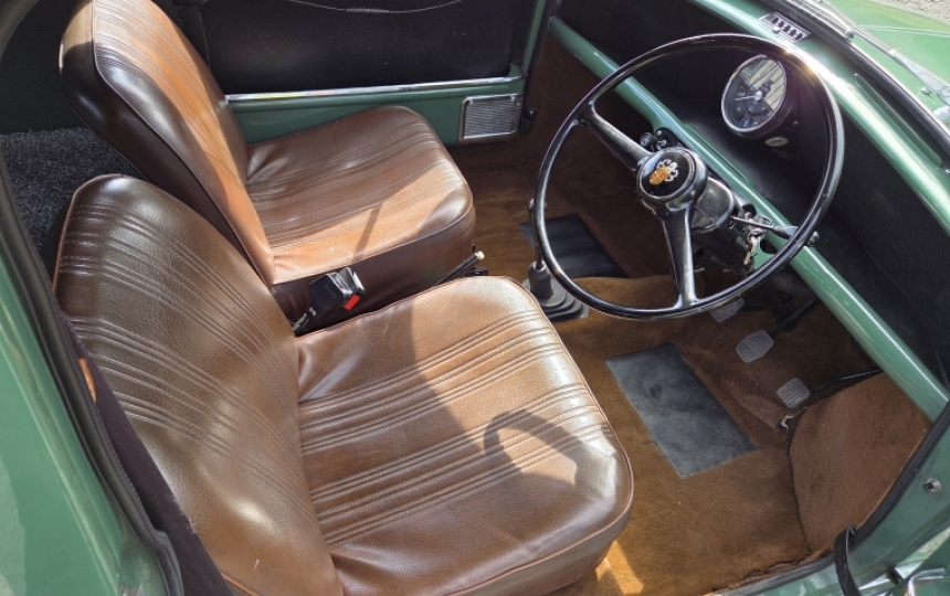 Interior - Basic, as they were, but very tidy with brown seats. Sliding side windows and pull cord door handles. Back floor is lined and carpeted.